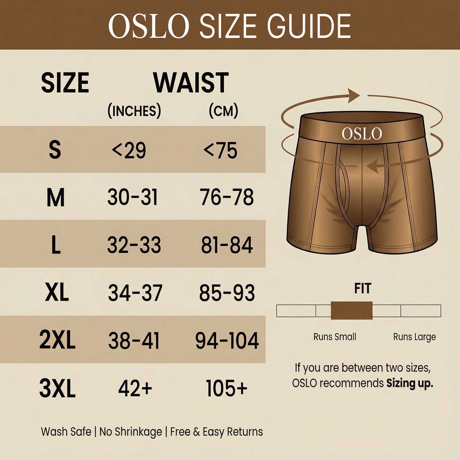 Because sizing is the number one issue in the market, OSLO includes a 90 day fit guarantee with easy exchanges or a full refund if it is not the most comfortable boxer you have ever worn.